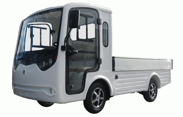 2-х местный электрический пикап с закрытой кабиной и длинным алюминиевым грузовым ящиком. Этот автомобиль подходит для различных целей, например, для технического обслуживания на промышленных площадках и в садах.